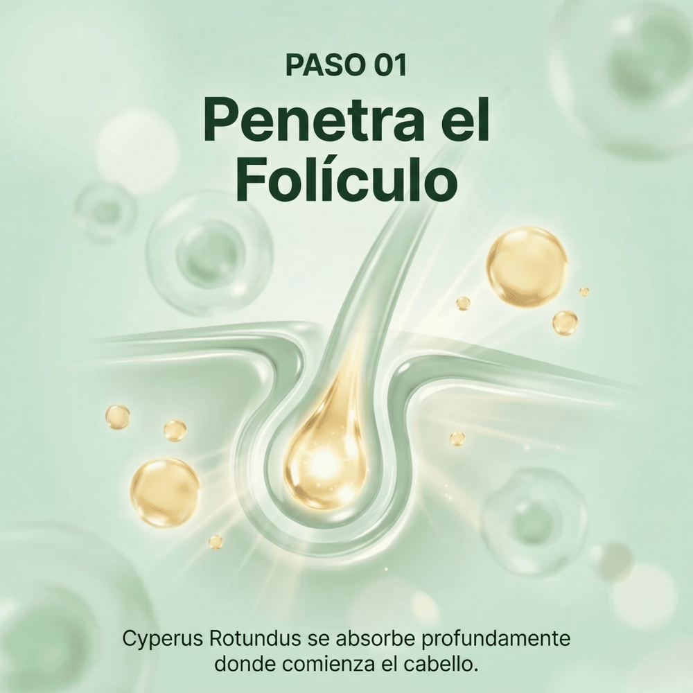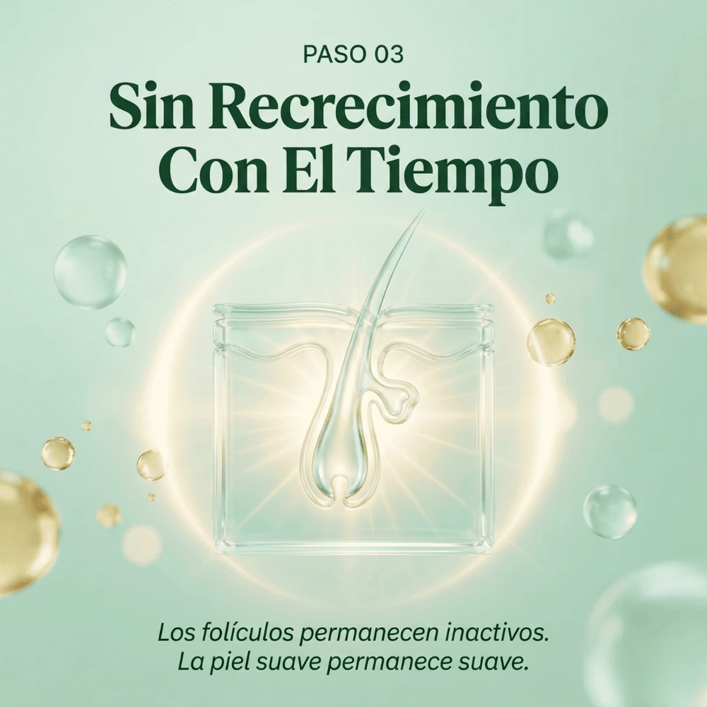 El secreto del Antiguo Egipto para debilitar folículos. Inhibe la enzima 5α-reductasa — la señal hormonal que genera el vello. Validado por Oxford 2014.